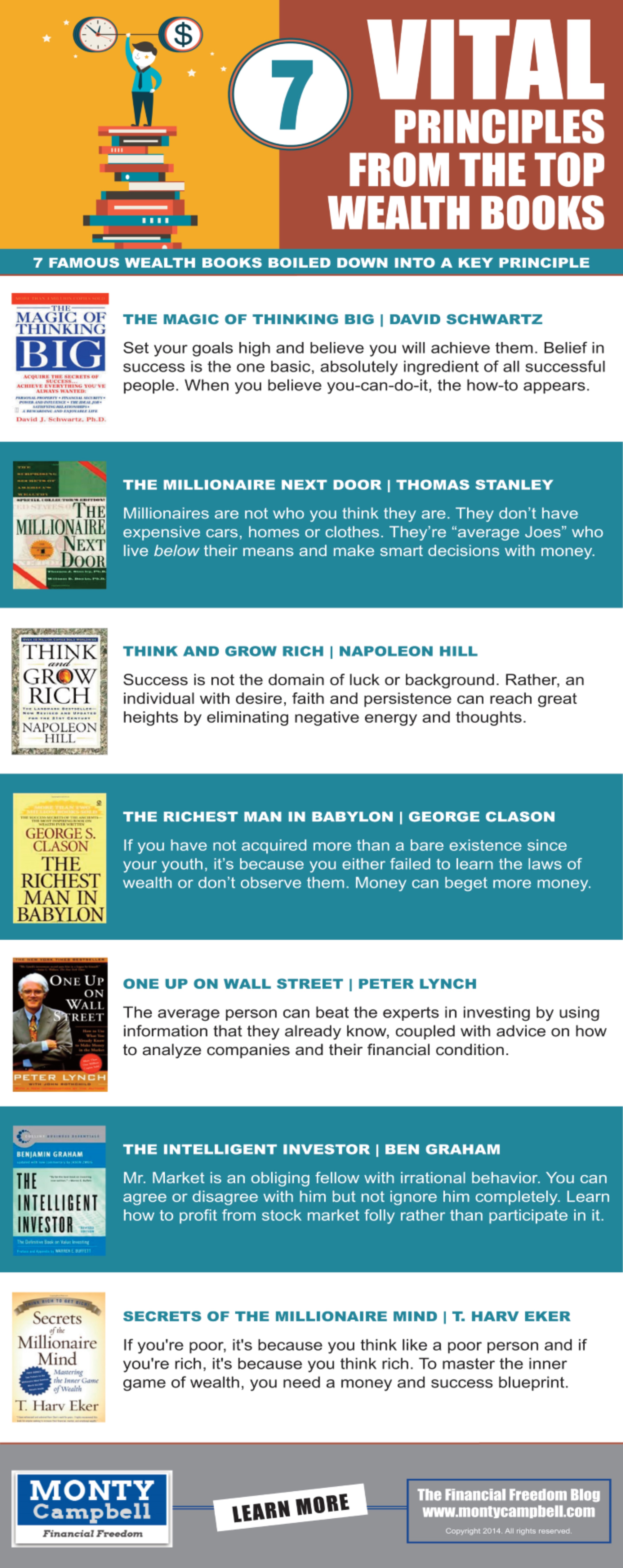 Have you ever wondered why so many self-help books don’t seem to help? I think there are basically two reasons for this: The first is that people simply don’t take action on the information in the book. The second reason is that sometimes there’s so much information in the book, it can be difficult to focus on one main learning. Today’s infographic helps with that, by boiling-down the one vital principle to learn from seven top wealth building books.